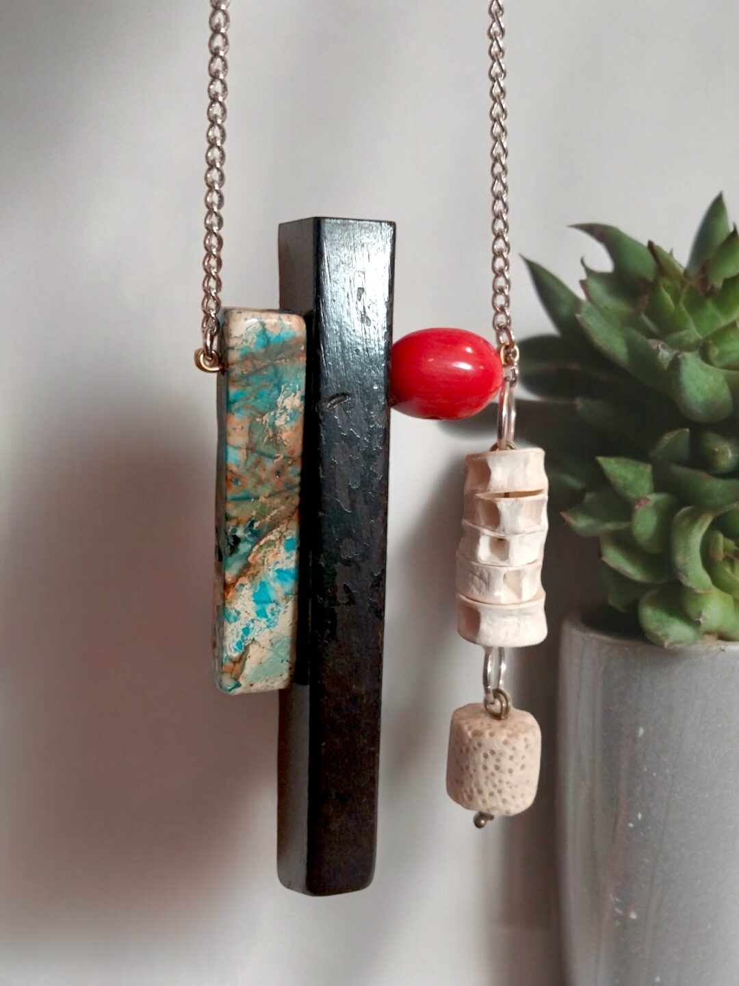 Angela’s deep dive into the emotive practice of singing, songwriting, and musical performance inspired the creation of statement jewelry sets utilizing salvaged piano keys and other upcycled elements.