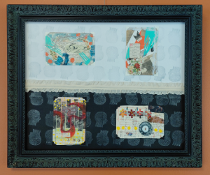 Gallery Presentation: 4 Multimedia Collages (eadh measuring 6″x4″ and 4″x6″) are intentionally framed without the inclusion of a plate of glass obstructing the art. COntact for exact frame dimensions.